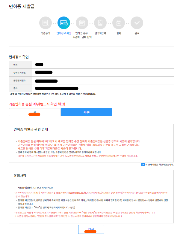 면허정보를 확인하신 뒤, 기존면허증 분실 여부에 체크를 해주시고